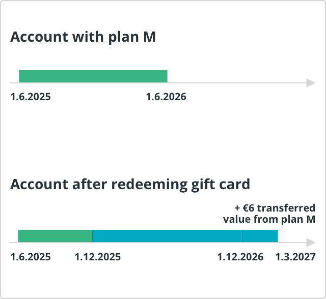 Example: A user activated paid plan M (worth €12) on June 1 (1.6.) and redeems a gift card for plan L on December 1 (1. 12.), which means that a full 6 months, or 50%, of the original plan remains unused. This means that a remainder of €6 is transferred to the new plan, which is extended in proportion to the transferred value. In this case, €6 represents 25% of the full price of plan L (worth €24), so 3 months are added to the duration of the new plan.