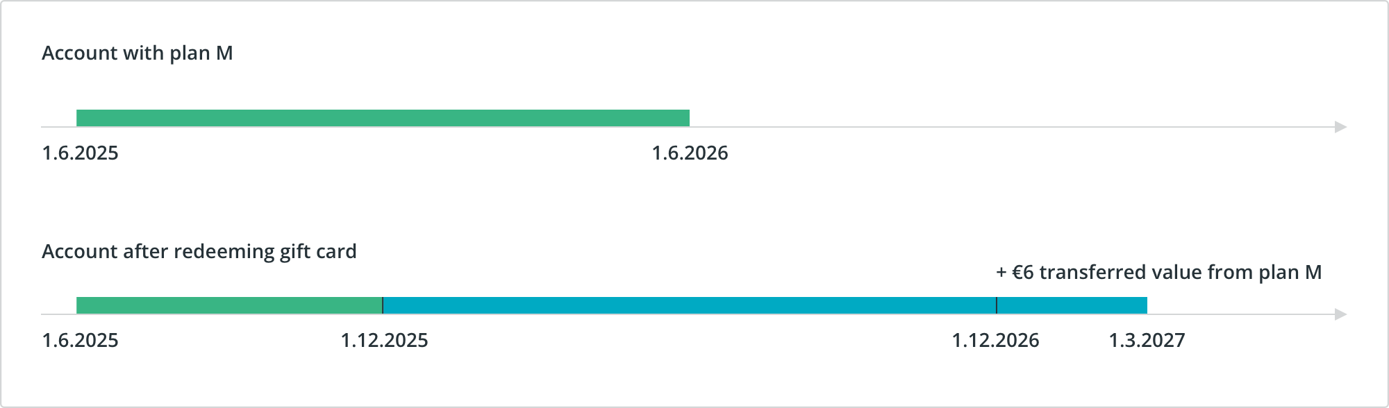 Example: A user activated paid plan M (worth €12) on June 1 (1.6.) and redeems a gift card for plan L on December 1 (1. 12.), which means that a full 6 months, or 50%, of the original plan remains unused. This means that a remainder of €6 is transferred to the new plan, which is extended in proportion to the transferred value. In this case, €6 represents 25% of the full price of plan L (worth €24), so 3 months are added to the duration of the new plan.